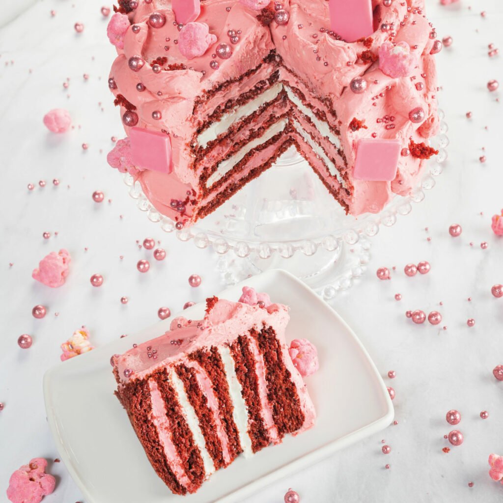 El Pastel Pink Velvet (bizcocho Velvet, relleno de queso crema con vainilla de Papantla y betún acidulado de fresas silvestres).