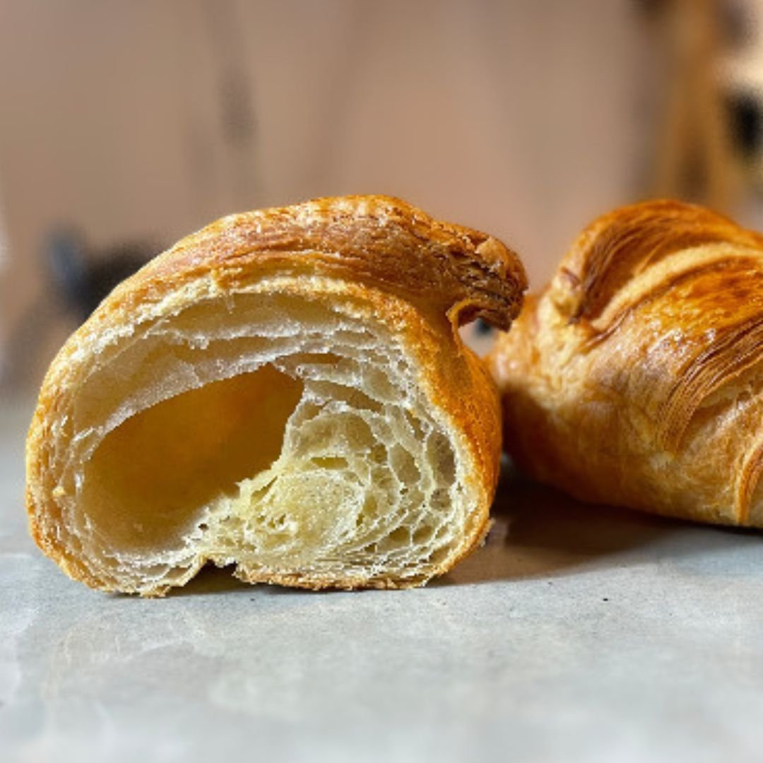 Este se compone del número de capas que se alternan entre la masa del croissant y la mantequilla..  La técnica del hojaldre Consiste en encerrar capas de mantequilla en capas de masa para que, durante la cocción, el agua de la masa que se evapora quede atrapada por la capa de mantequilla y el vapor haga que la masa del croissant suba. El número de vueltas es como máximo de seis, lo que representa 730 hojas de temple y 729 capas de mantequilla. AQUI las instrucciones de horneo en vídeo de nuestro croissant.